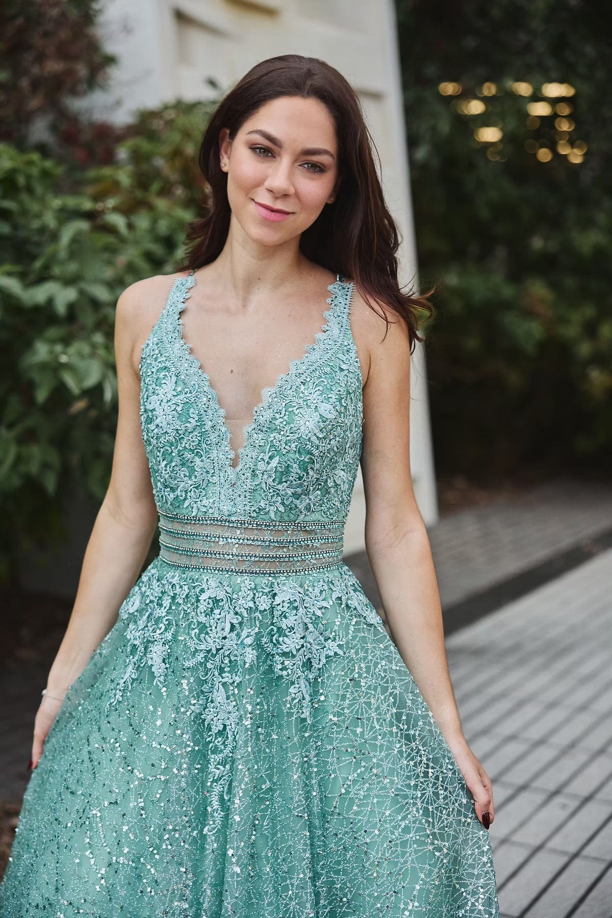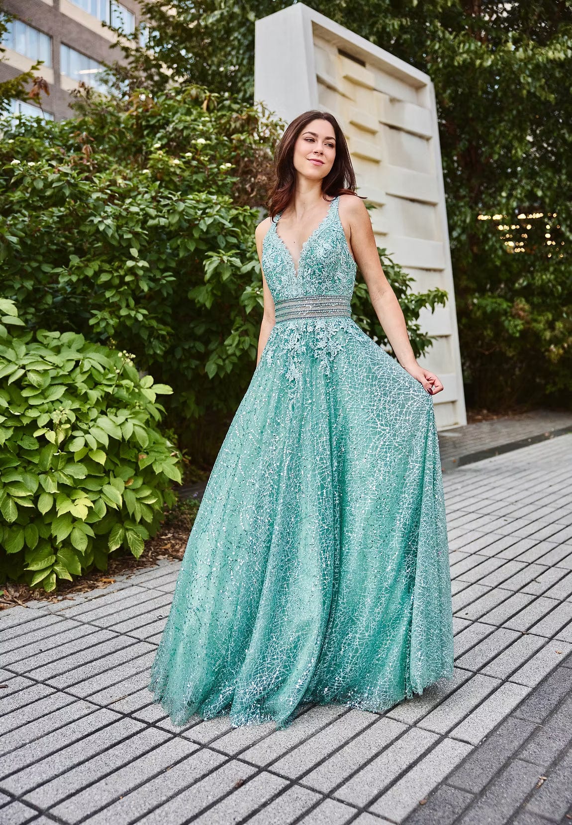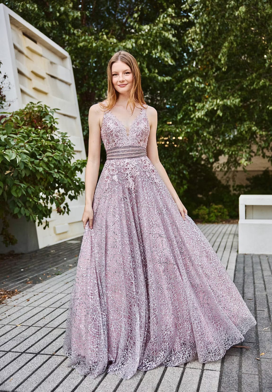 This breathtaking gown is a true showstopper, adorned with an intricate glittery lace overlay that gives it an enchanting, starlit effect. The fitted waistline is highlighted by sheer bands edged with shimmering beads, adding a touch of elegance. The skirt is crafted to capture light from every angle, creating a dazzling, super-sparkly look that’s perfect for making a grand entrance!