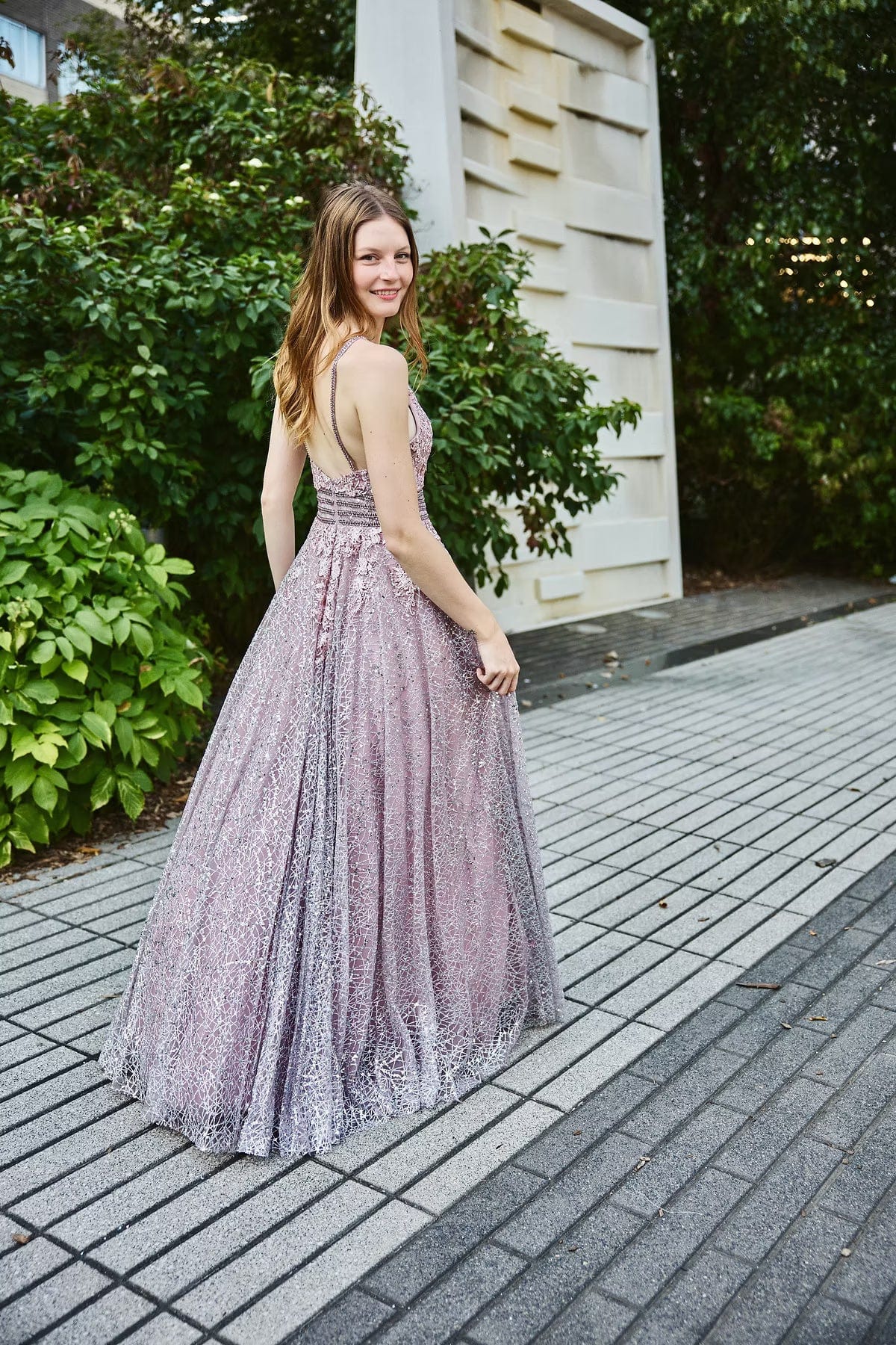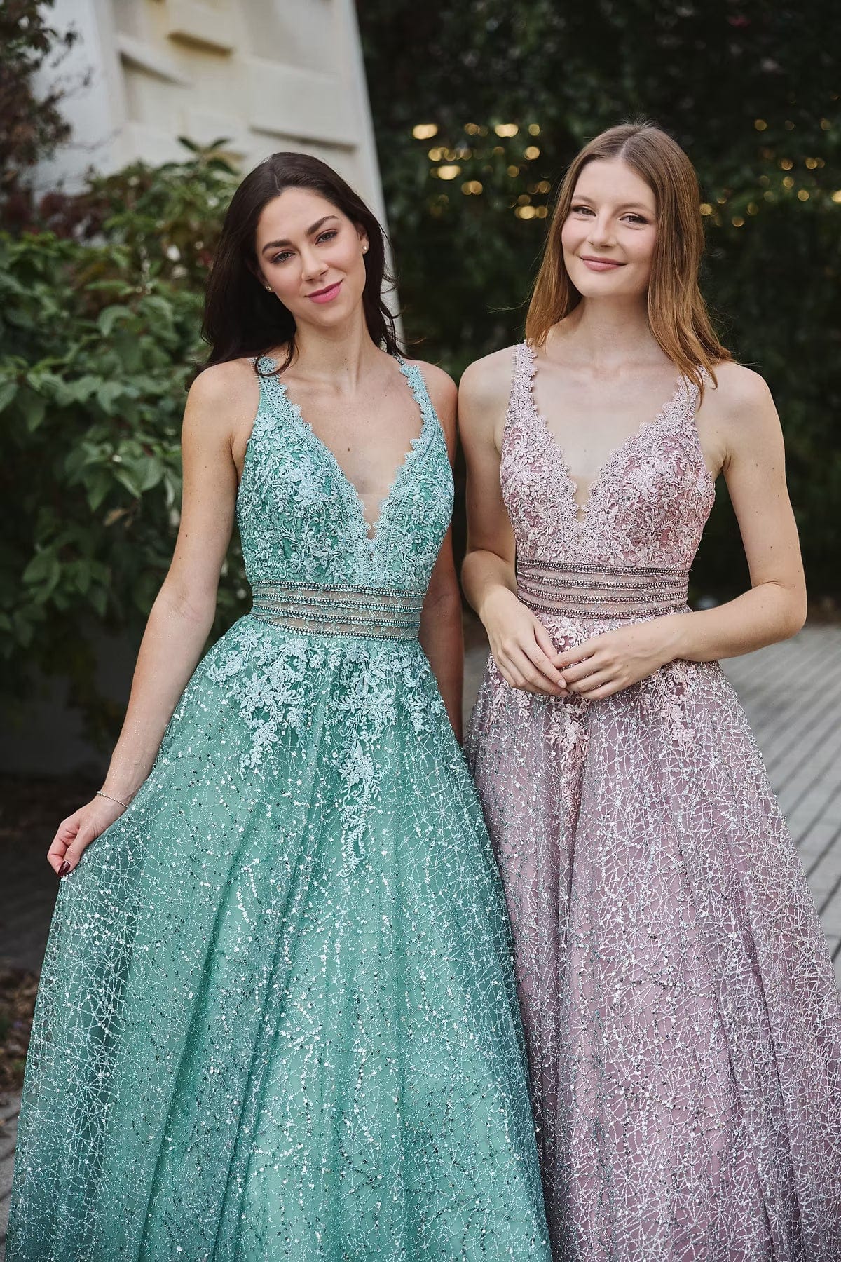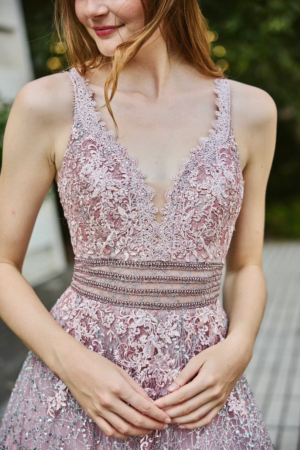This breathtaking gown is a true showstopper, adorned with an intricate glittery lace overlay that gives it an enchanting, starlit effect. The fitted waistline is highlighted by sheer bands edged with shimmering beads, adding a touch of elegance. The skirt is crafted to capture light from every angle, creating a dazzling, super-sparkly look that’s perfect for making a grand entrance!