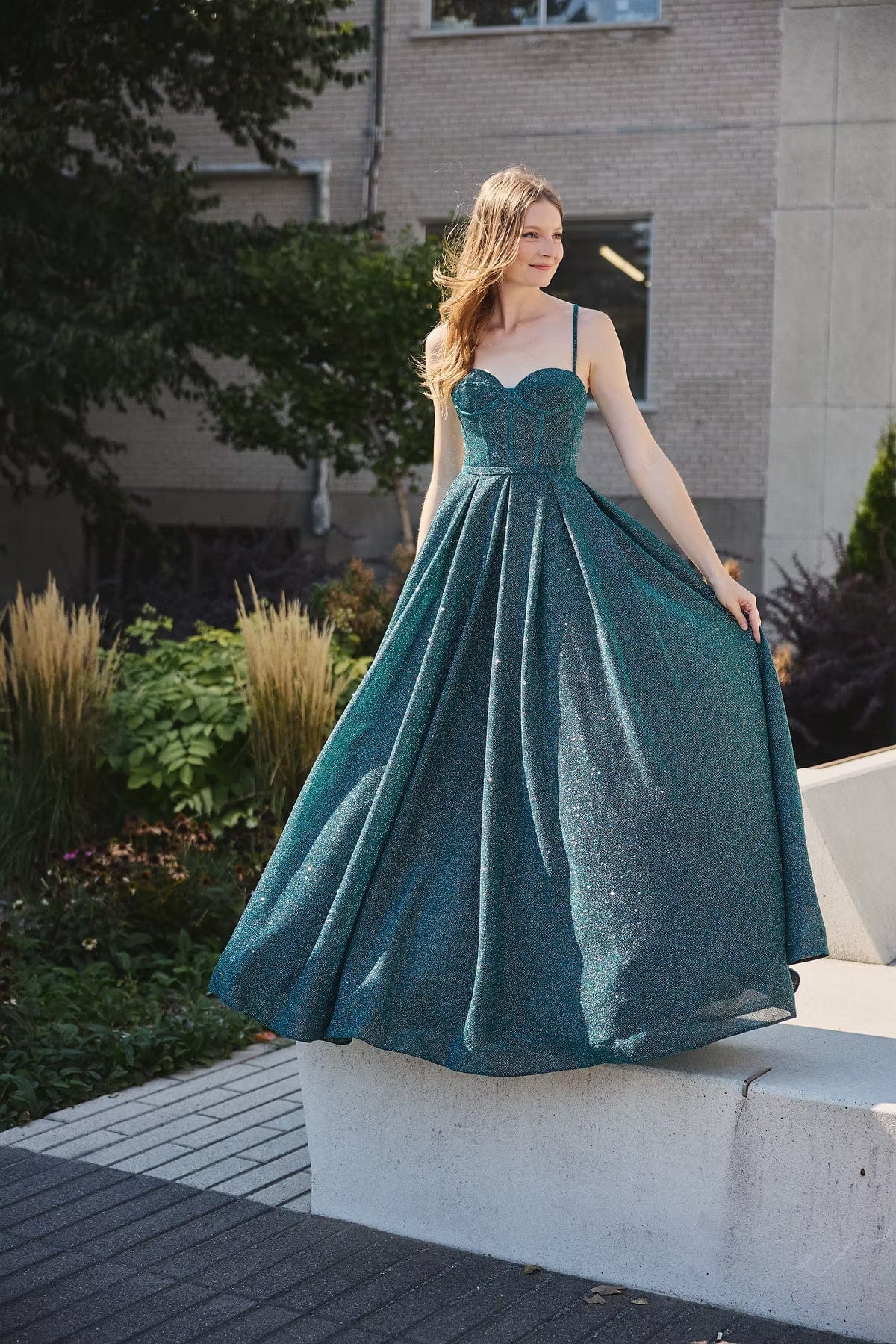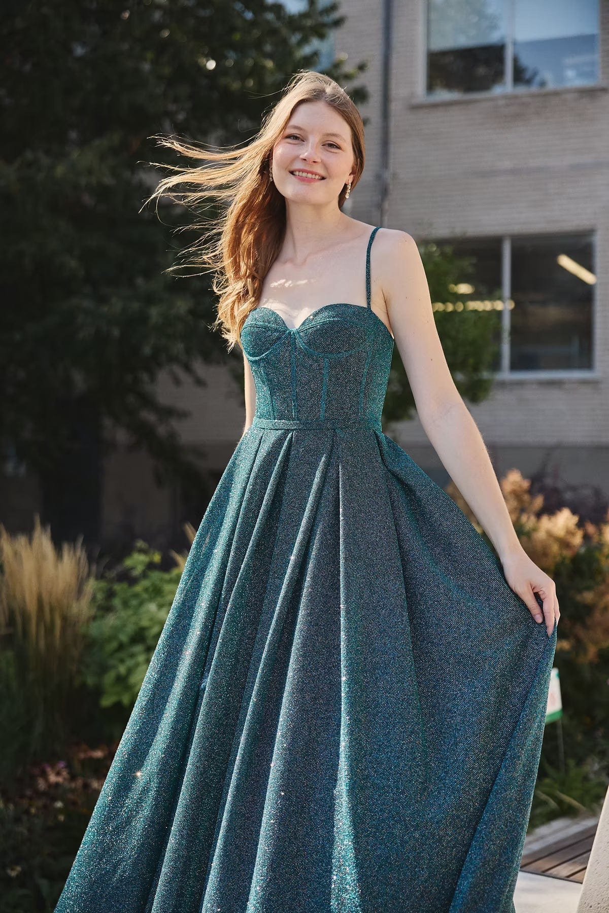 This stunning A-line ballgown is crafted from a rich, dark teal or forest green fabric that features an all-over shimmer or glitter effect, giving it a dazzling, textured look. It has a fitted bodice with a sweetheart neckline and thin, delicate spaghetti straps. The bodice appears structured, possibly with boning, which transitions into a dramatically full, floor-length skirt that creates an elegant and voluminous silhouette. The overall aesthetic is one of glamour and formality, making it a perfect choice for a prom, gala, or black-tie event.