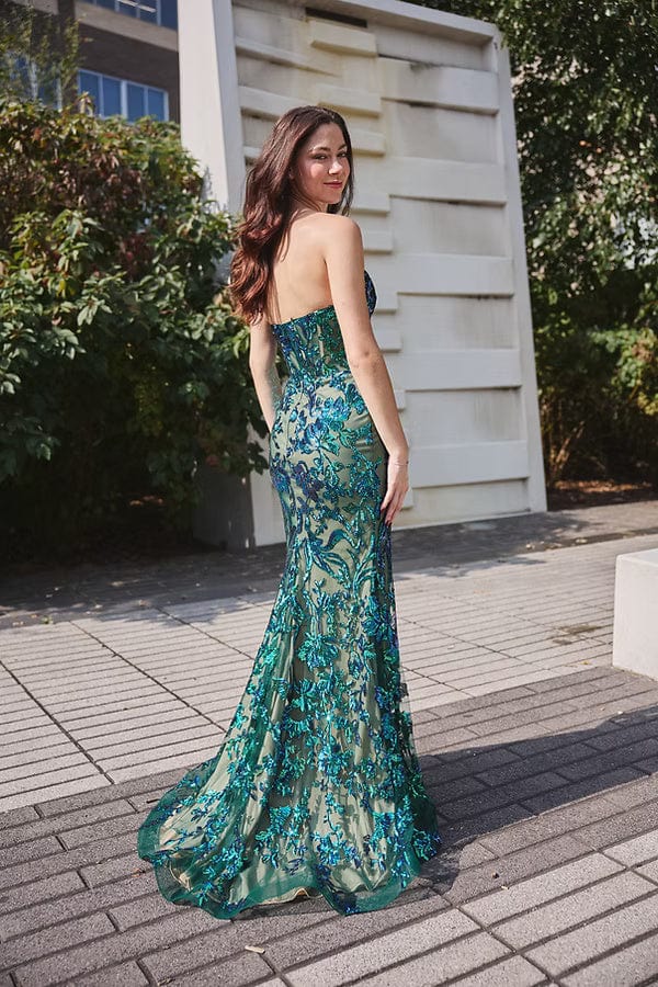 This full-length strapless gown dazzles with a rich palette, adorned in intricate sequins and beadwork that catch the light beautifully. Its mermaid silhouette flatters your figure, hugging the body smoothly to the knees before flaring out gracefully. The high thigh slit, paired with a subtle nude lining, adds a modern, bold touch while maintaining elegance, making it perfect for standing out confidently at any formal event.