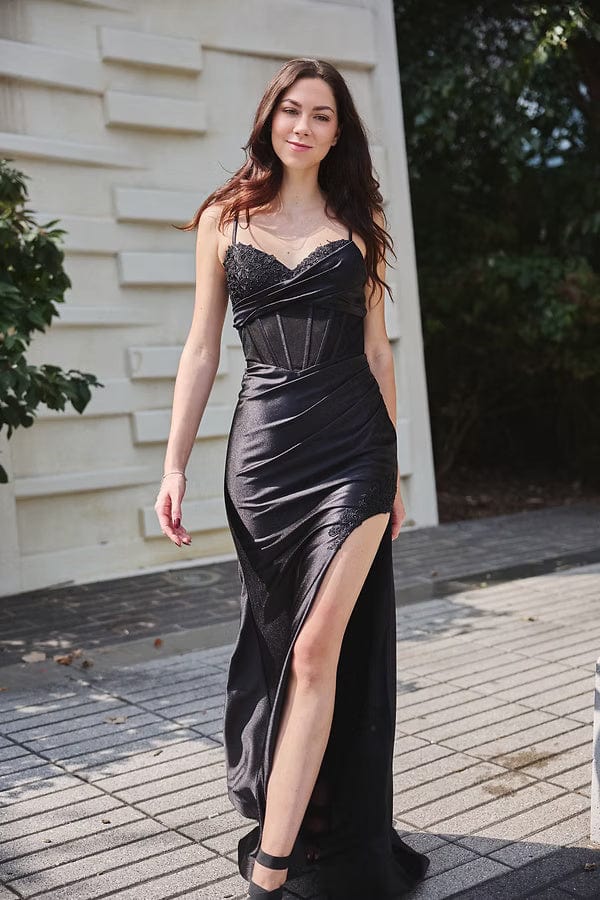 This floor-length black gown offers a modern, structured design that beautifully enhances your figure. The spaghetti-strap bodice features a corset-style construction with vertical boning to create a flattering, cinched silhouette. A sweetheart neckline, softly trimmed with delicate black lace or embroidery, adds a graceful, feminine contrast to the bold structure. Perfect for prom or any special occasion where you want to feel confident and elegant.