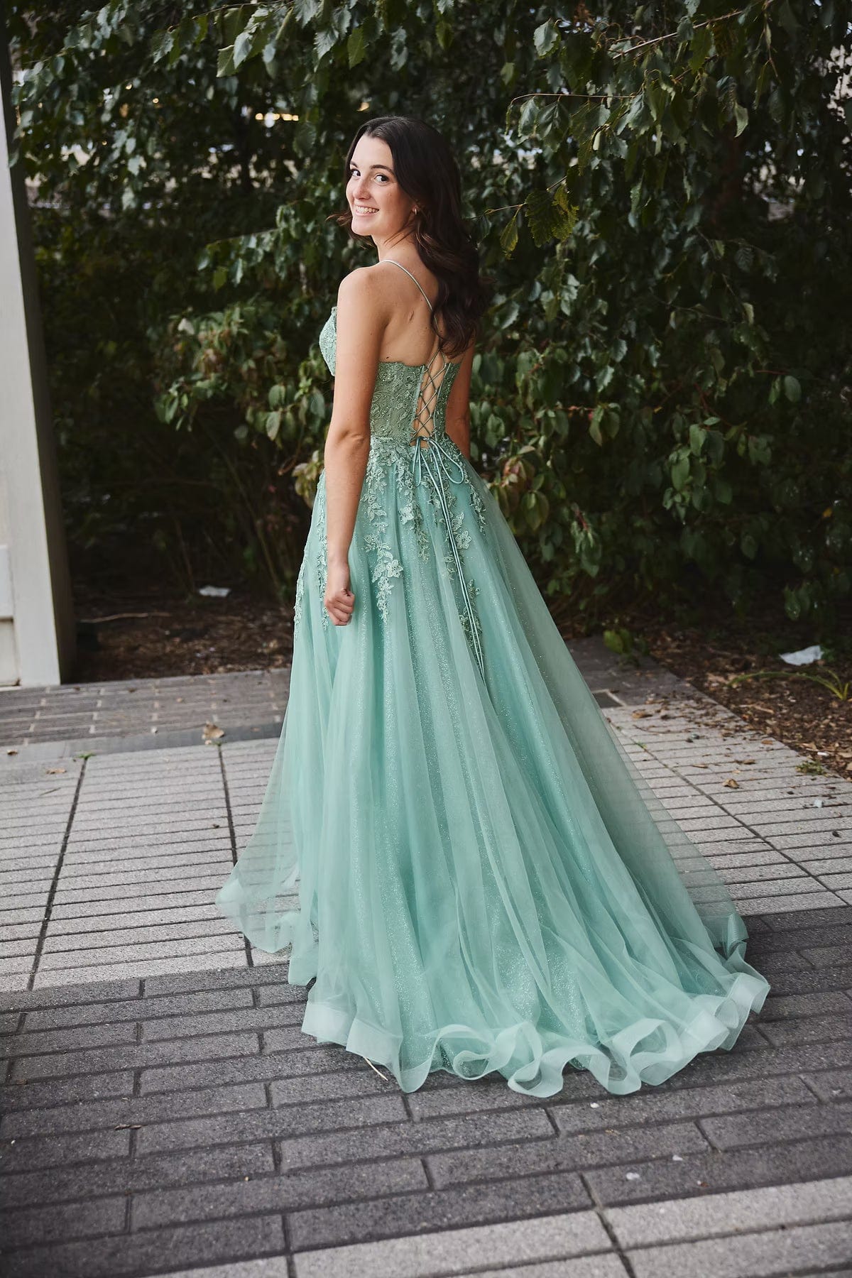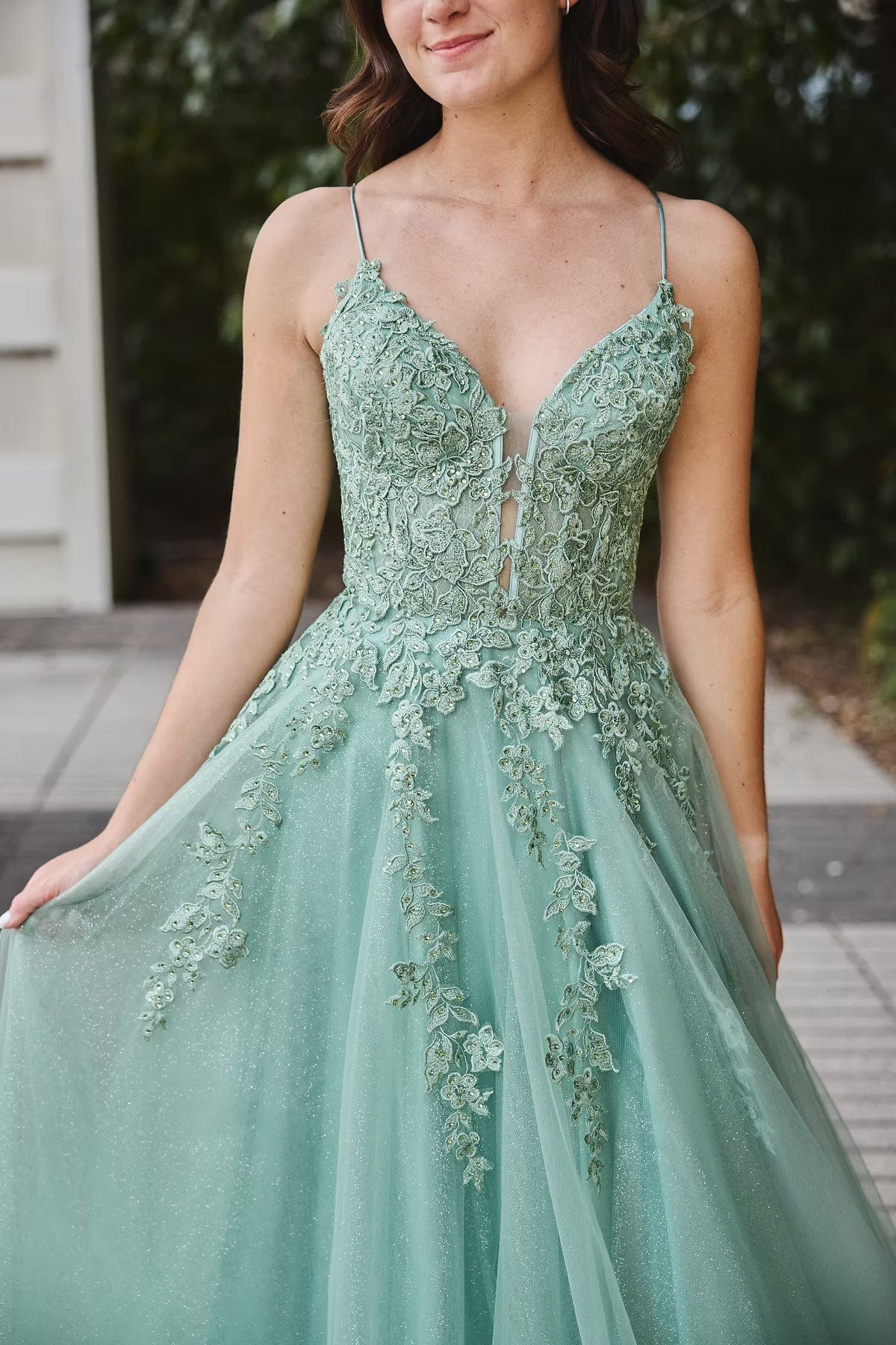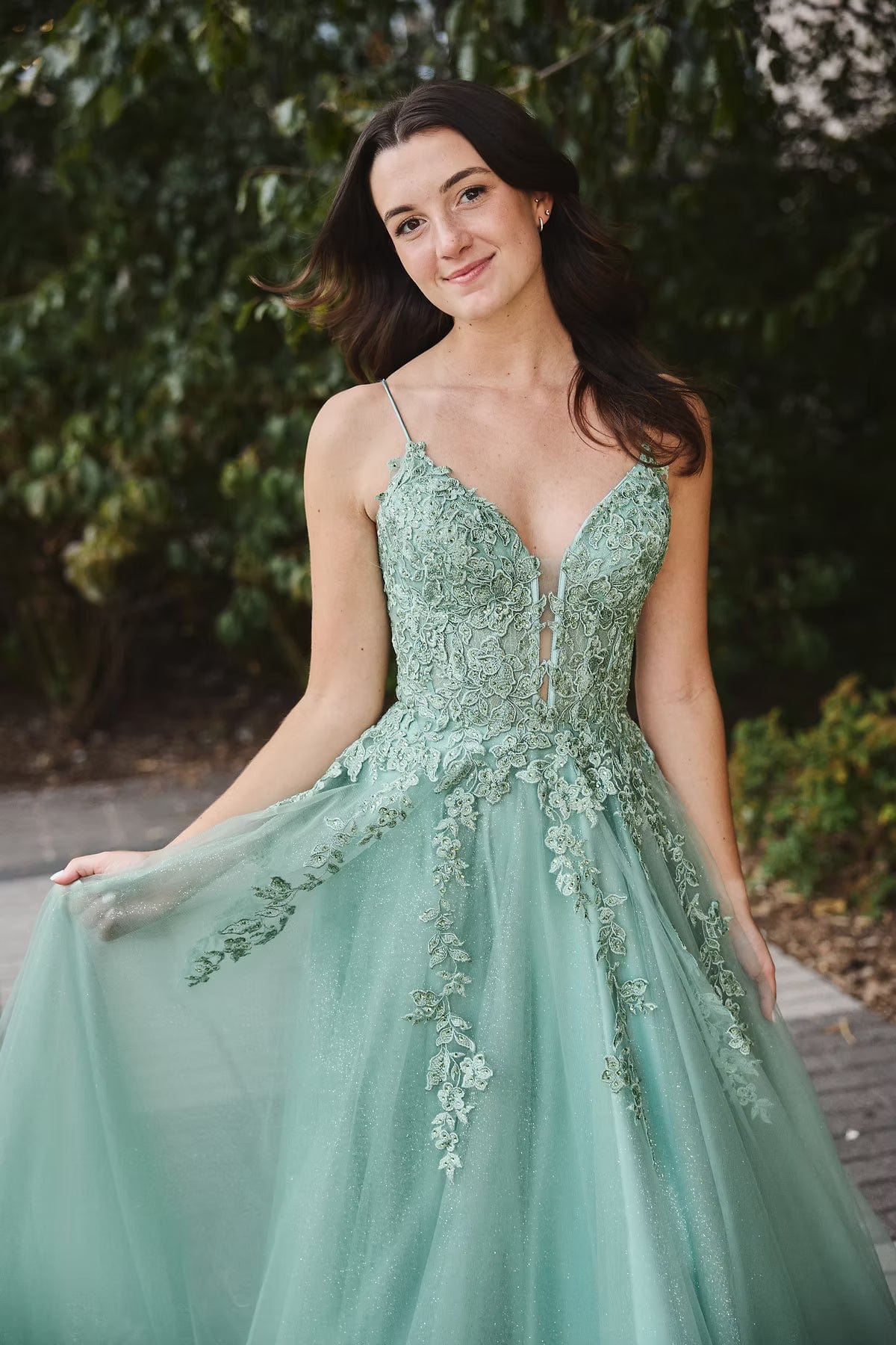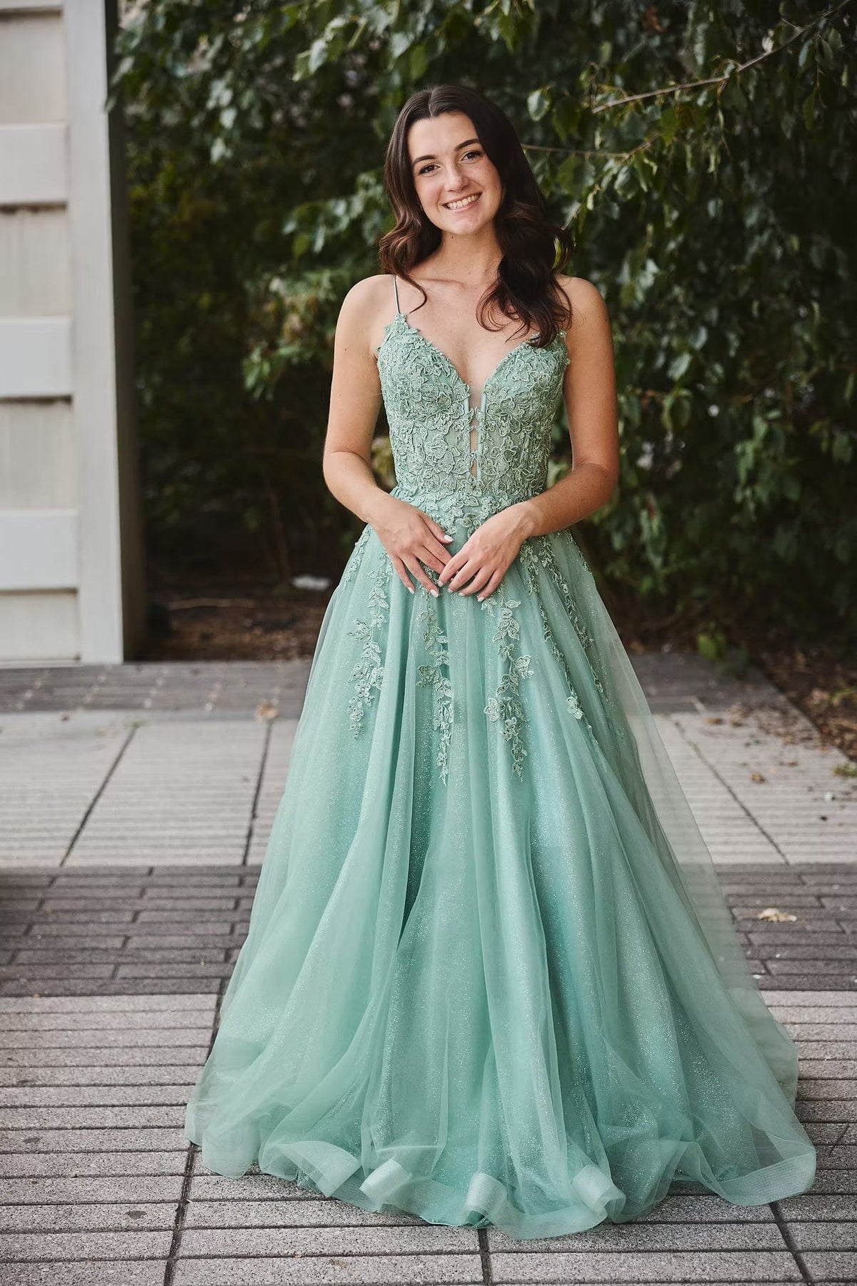 This stunning prom dress features a delicate, sparkle tulle that catches the light beautifully, adding a subtle shimmer.. The bodice is designed with a flattering V-neckline and thin spaghetti straps and accented with tiny beads for an elegant, feminine touch. The voluminous, A-line skirt, creating a dreamy, princess-like silhouette.