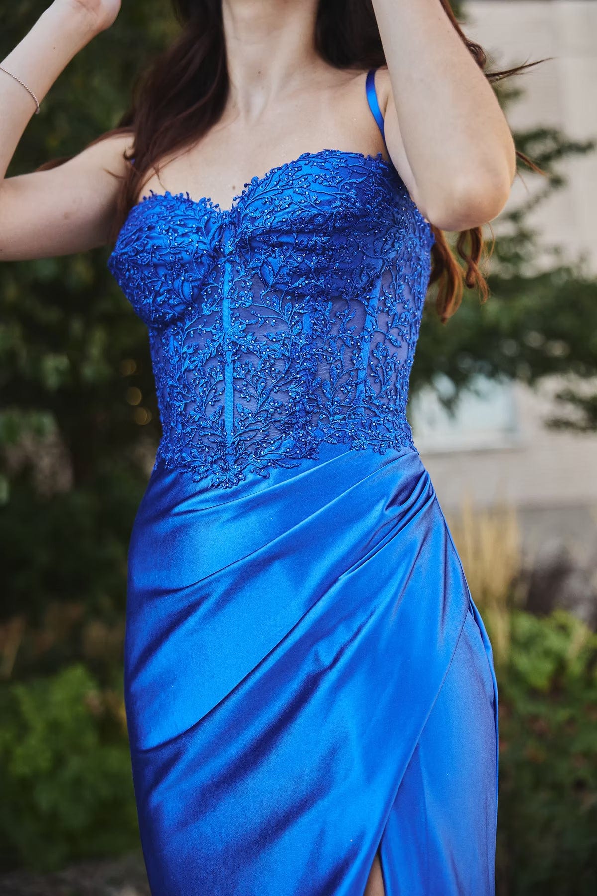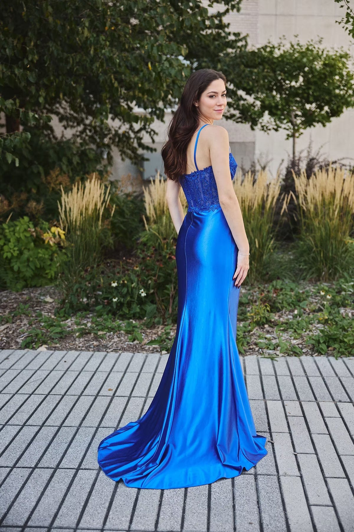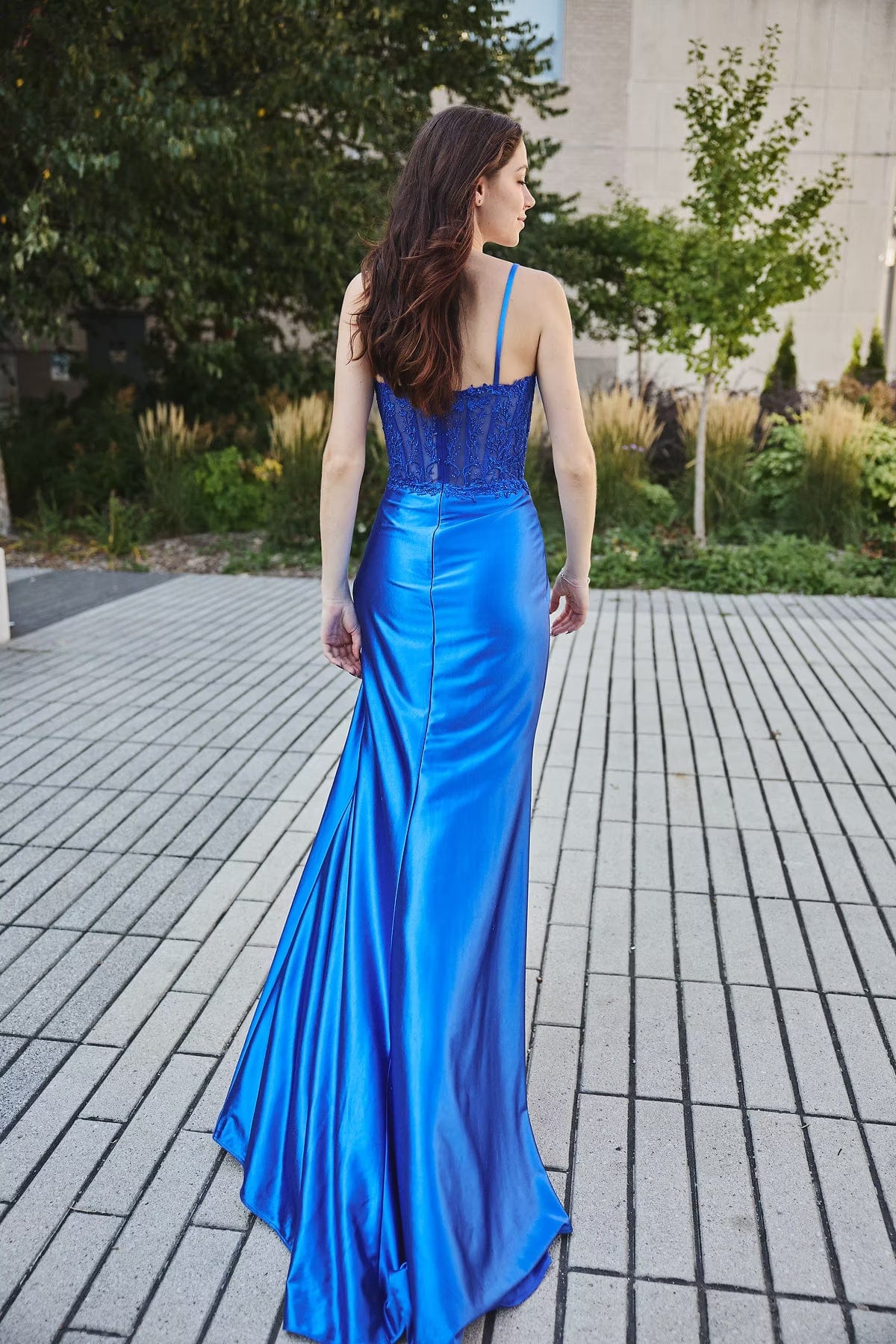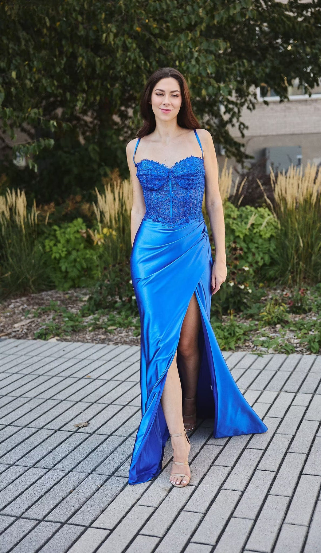 This stunning gown combines elegance and glamour, making it the perfect choice for any formal occasion. Featuring a fitted bodice made of intricate lace detailing with subtle sparkle for texture and sophistication. The structured bodice features thin spaghetti straps for support and a sweetheart neckline. The luxurious, silky satin fabric gracefully hugs your curves, while the leg split adds a touch of glamour and ease of movement.