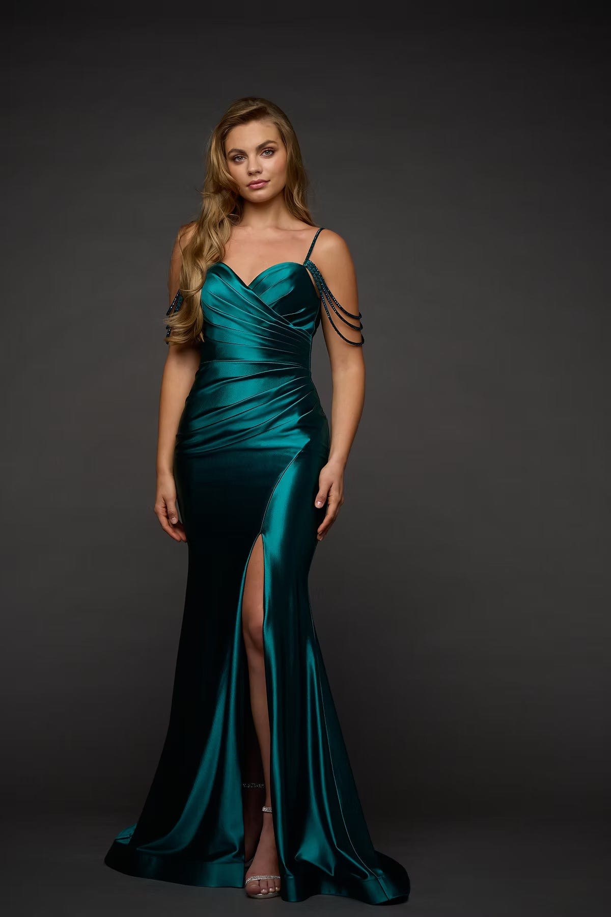 The perfect blend of sophistication and modern elegance. Designed with a flattering sweetheart neckline and delicate draping, the bodice enhances your natural shape while offering a refined, timeless look. The standout feature is the beaded draped shoulder straps that add a touch of glamour and uniqueness to this sleek design.