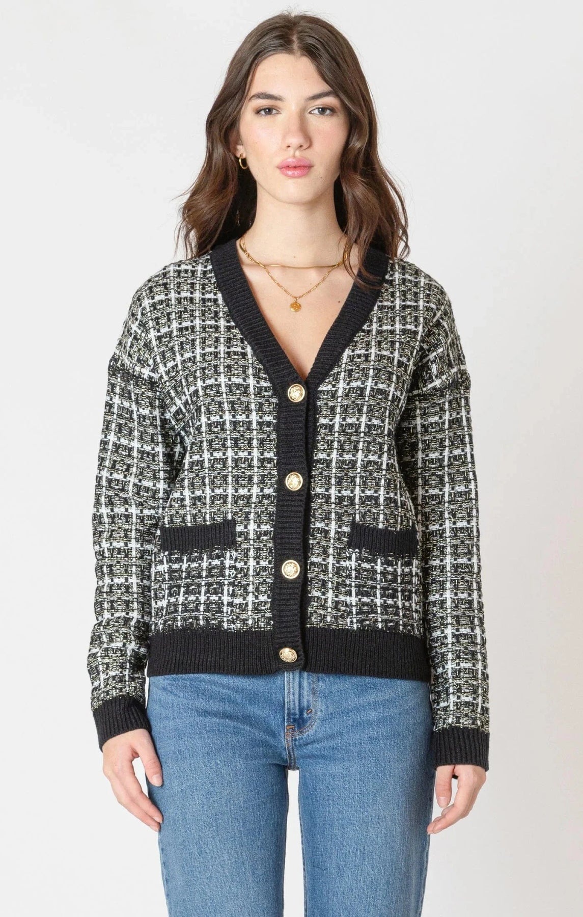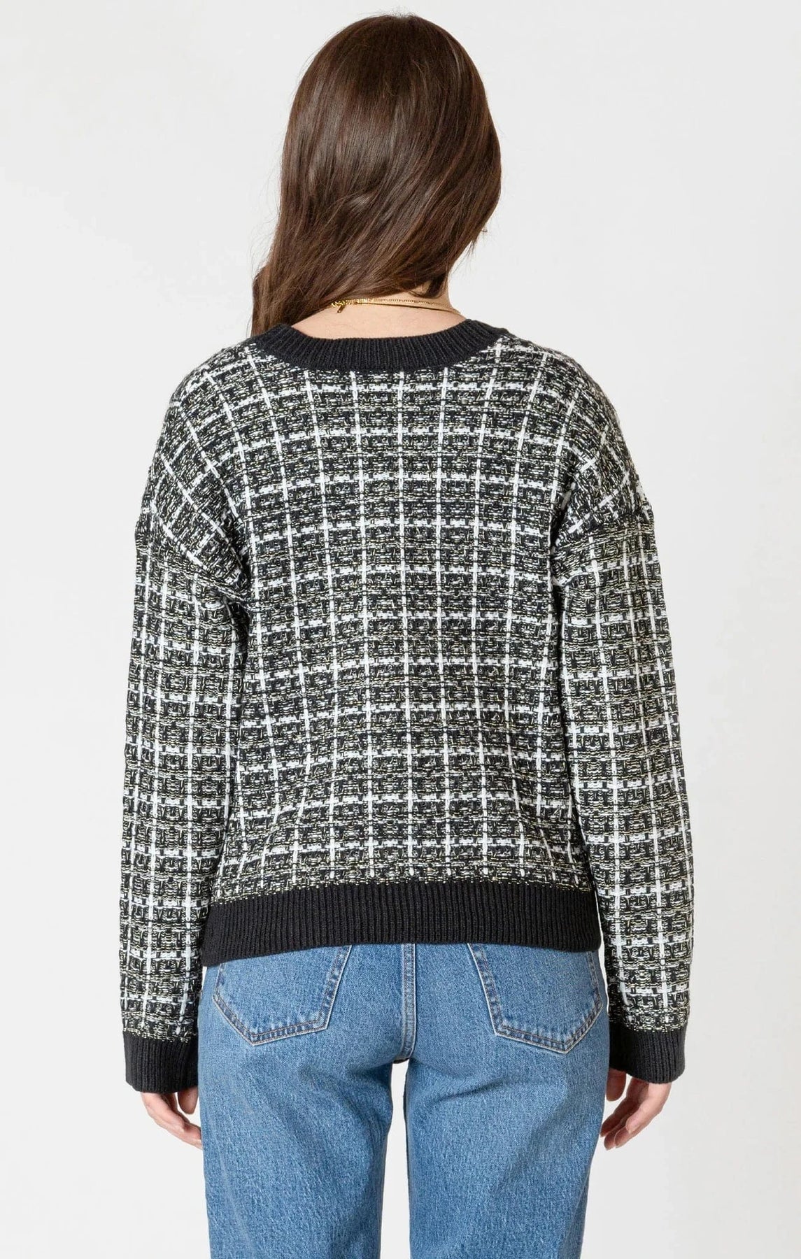 This cardigan features a timeless black and white tweed pattern, making it easy to pair with both casual and dressier outfits. Delicate gold threads woven throughout add a subtle shimmer, while gold buttons enhance its refined look. Crafted with a high acrylic content, it offers softness and lightness, providing comfortable warmth on cooler days. Perfect for adding a touch of elegance to your wardrobe with everyday ease.