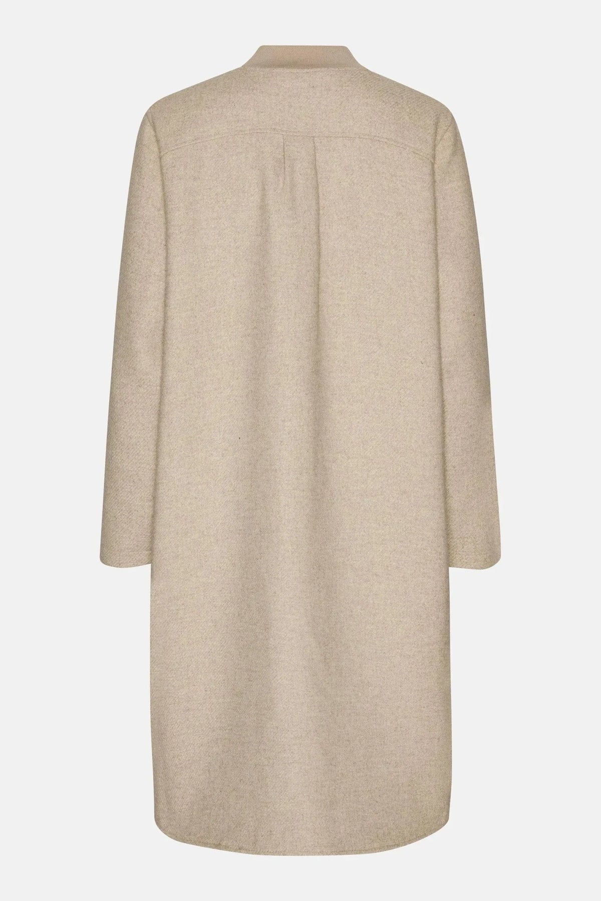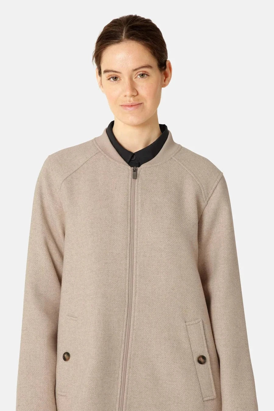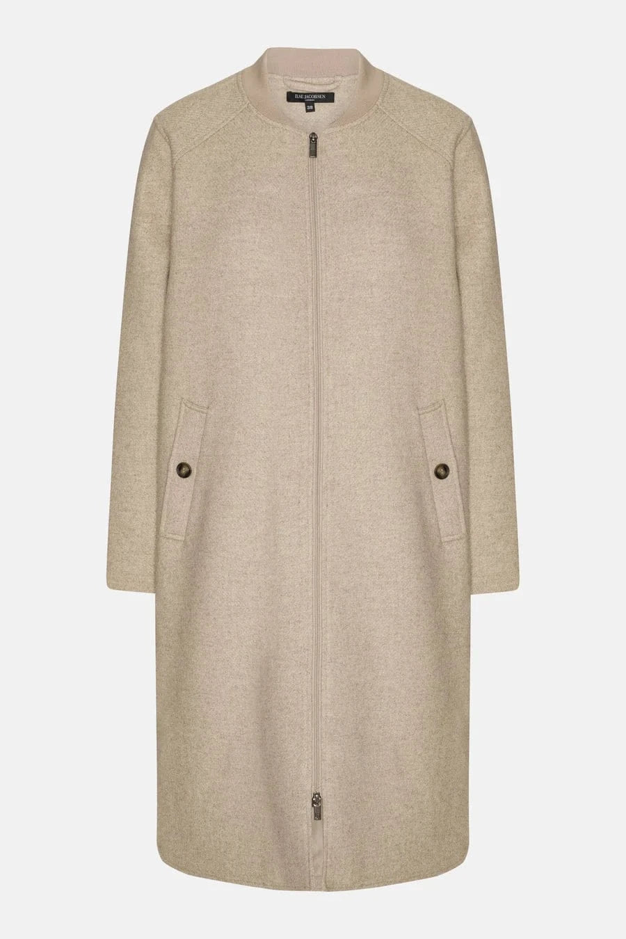 A long and A-line wool coat featuring a soft lining for added comfort. Side slits with logo horn button allow easy movement, while the two-way logo zipper and soft ribbed collar and cuffs add a sporty finish. Ideal as a mid-layer under a raincoat for extra warmth.