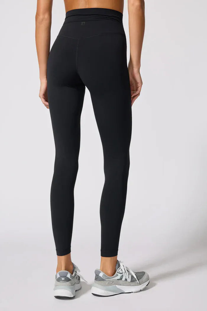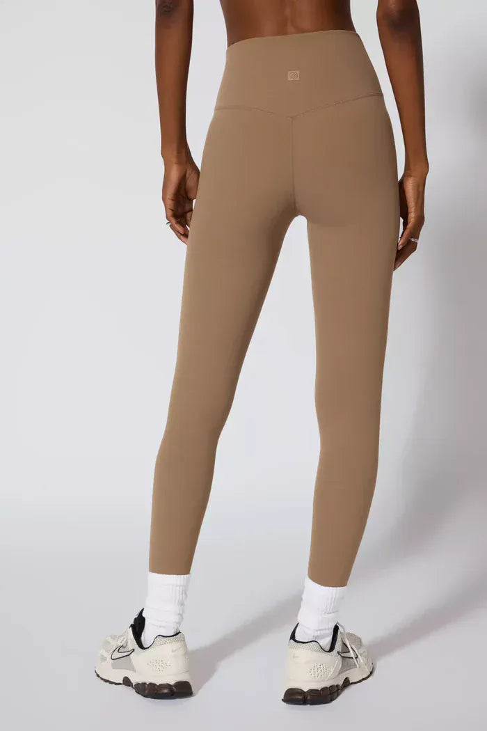 Crafted from 75% recycled nylon and 25% spandex, these high-waisted leggings deliver moisture-wicking performance to keep you dry and comfortable throughout your day. The luxuriously soft fabric feels smooth against your skin, while the V-shaped waistband and inseam gusset provide flattering support and enhanced flexibility. With a 26" inseam and fitted silhouette, they hug your curves beautifully. Ethically sourced and responsibly produced, these leggings combine sustainable practices with everyday comfort and style.